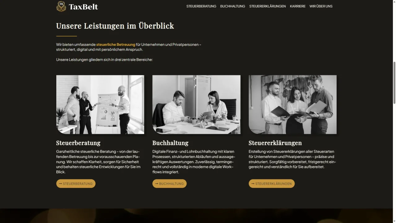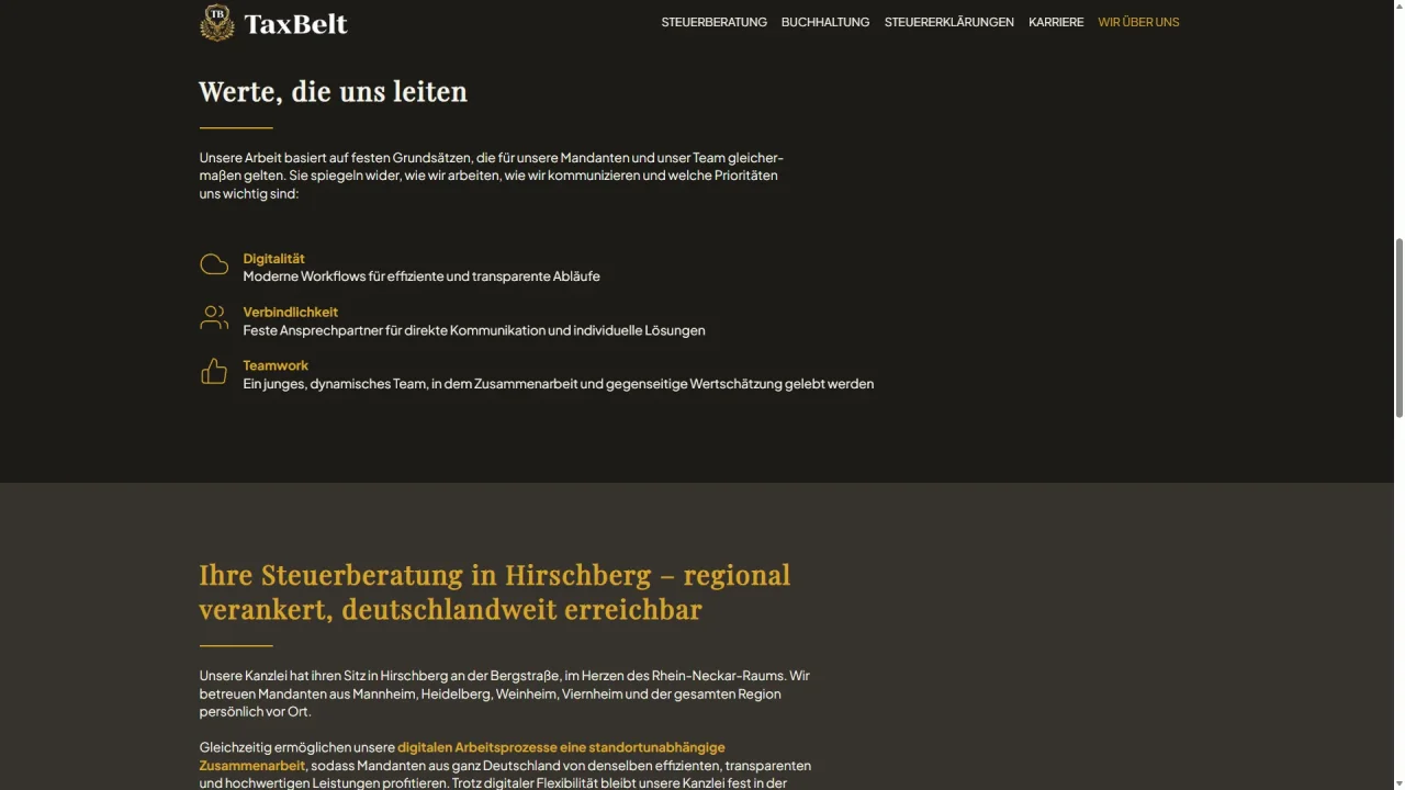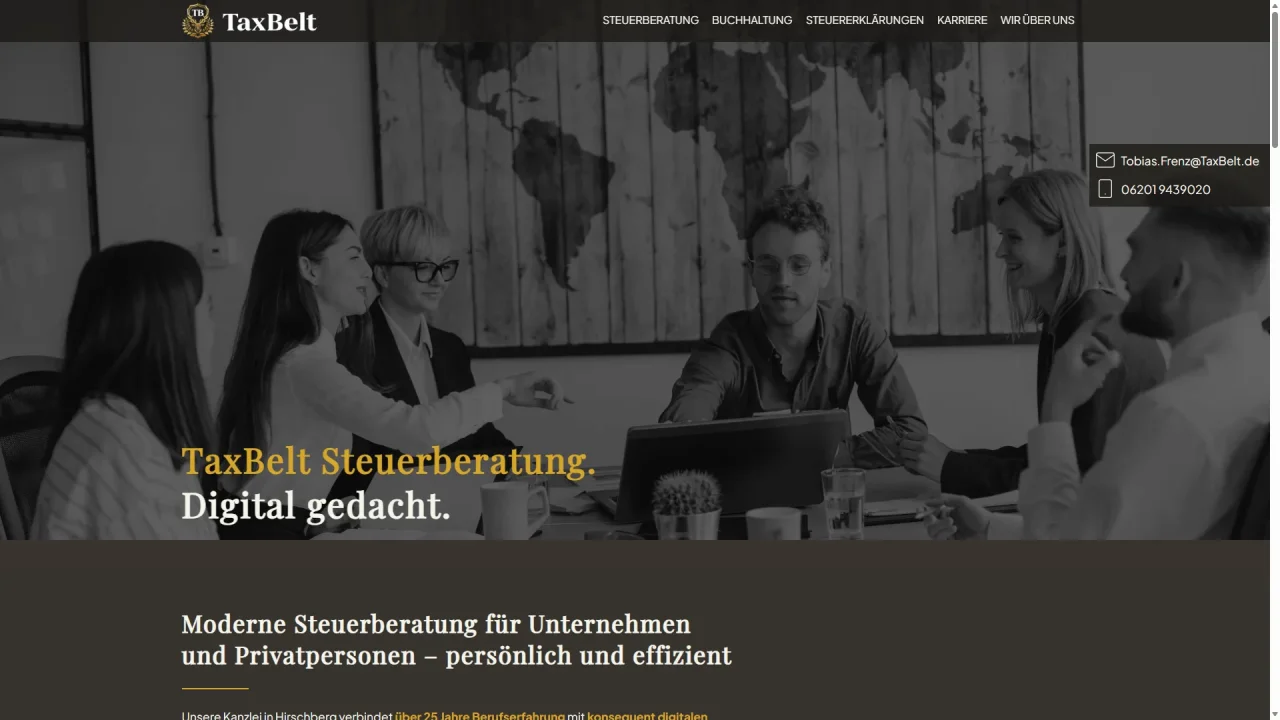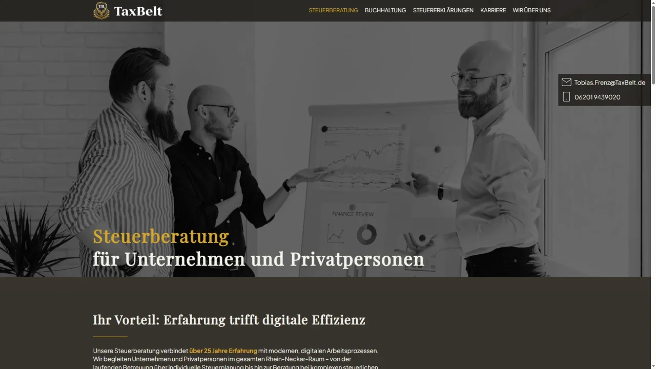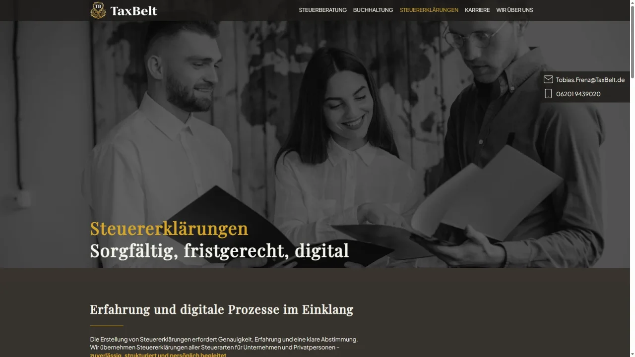 Das Ergebnis ist ein professioneller Webauftritt, der den Anspruch von TaxBelt konsequent widerspiegelt: Erfahrung. Digital gedacht.