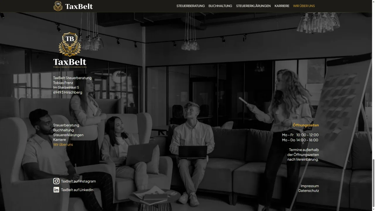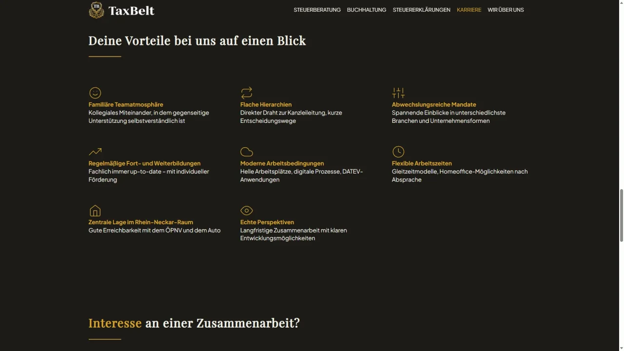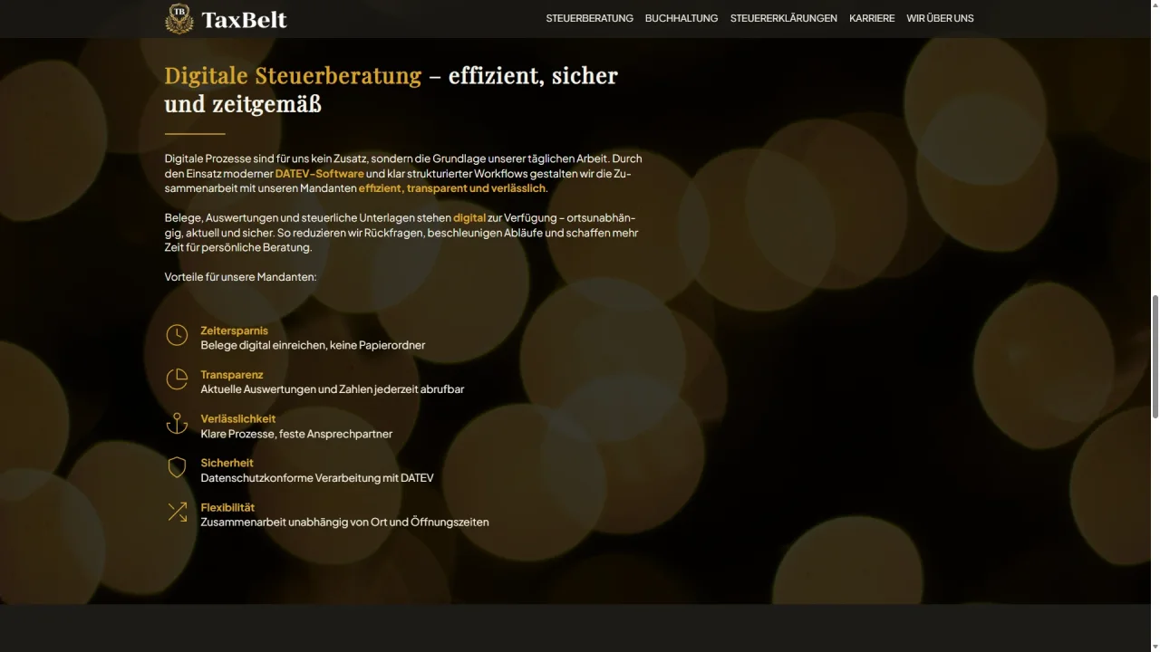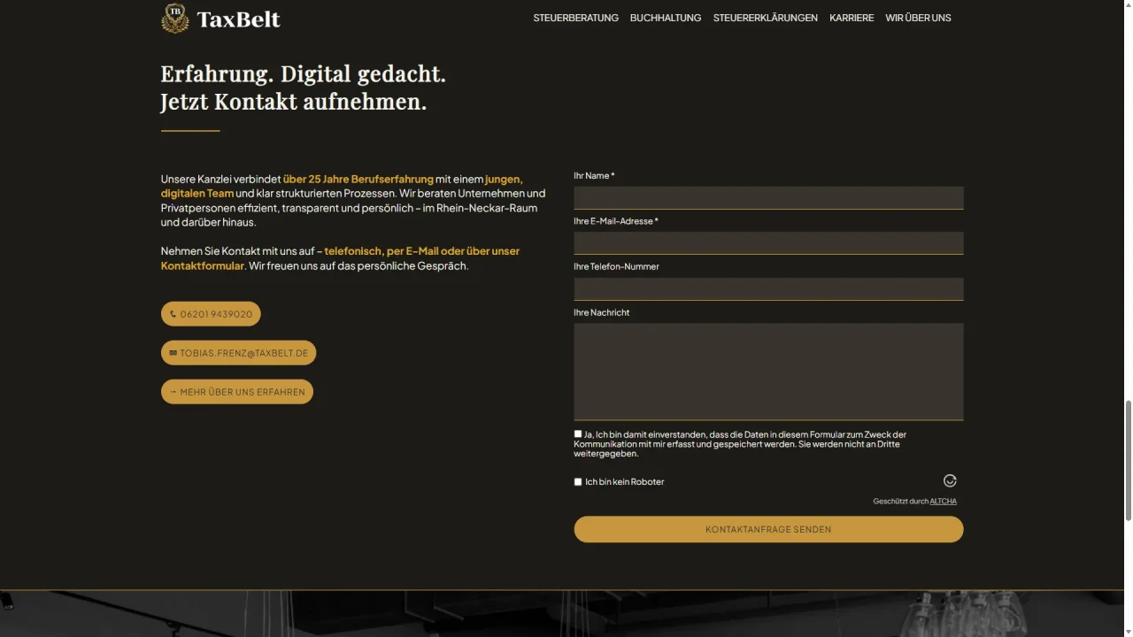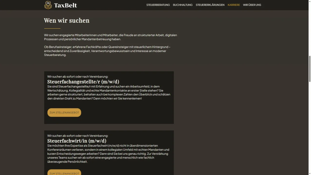 Das Ergebnis ist ein professioneller Webauftritt, der den Anspruch von TaxBelt konsequent widerspiegelt: Erfahrung. Digital gedacht.